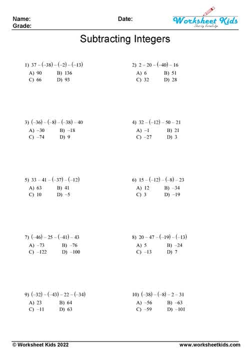 These worksheets typically include a mix of addition and subtraction problems involving integers. Students are required to apply the rules for adding and subtracting integers, such as keeping the sign of the larger number, to correctly solve each problem. By practicing with these worksheets, students can improve their understanding of integer operations and build confidence in their math skills.