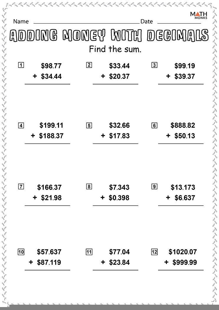 Adding Decimals Worksheets