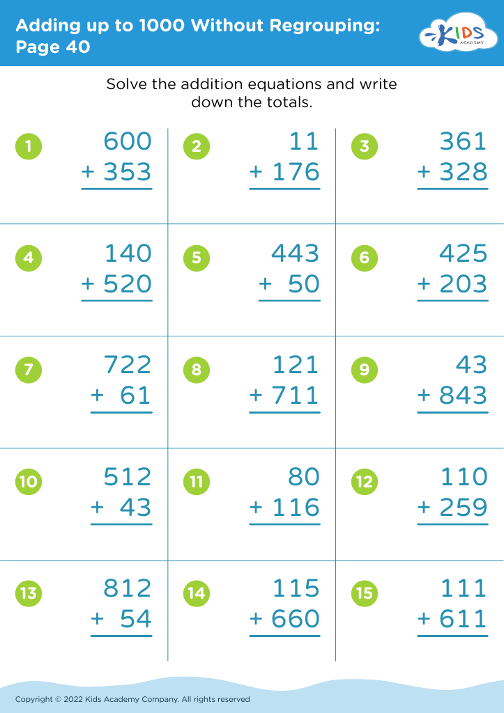 In conclusion, addition worksheets for grade 3 are a valuable tool for students to practice and improve their addition skills. These worksheets help students develop important math concepts and build a strong foundation in math. By incorporating these worksheets into their curriculum, teachers can help students achieve academic success and excel in math.