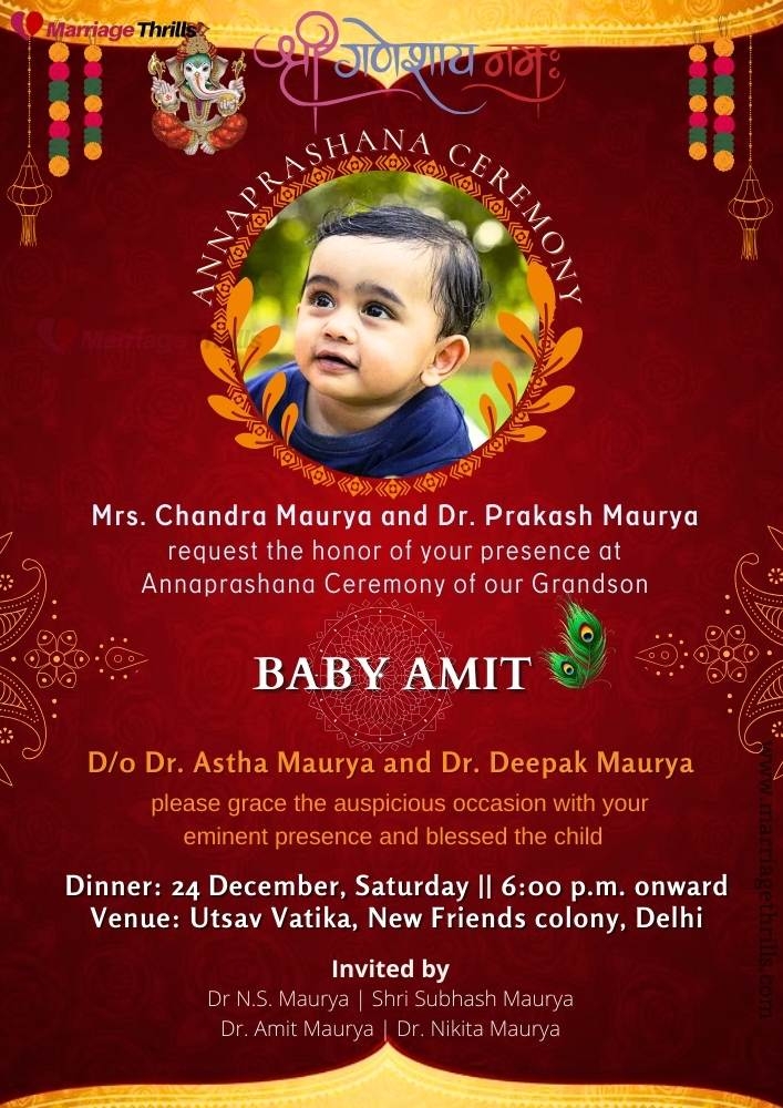 Annaprashan, also known as Mukhe Bhaat, is a traditional Hindu ceremony where a baby is fed solid food for the first time. It is a significant milestone in a child’s life and is celebrated with great joy and enthusiasm. One of the key elements of the Annaprashan ceremony is inviting friends and family to join in the celebration.