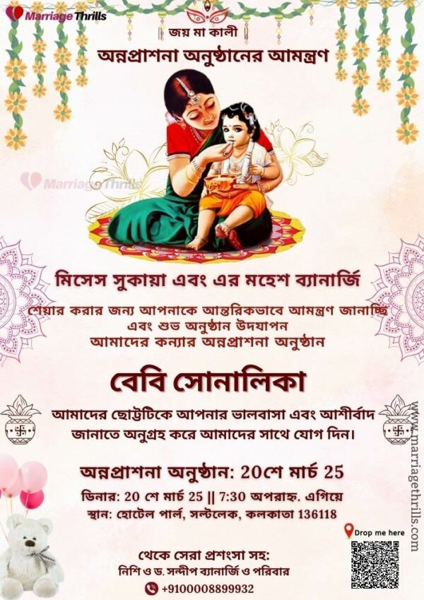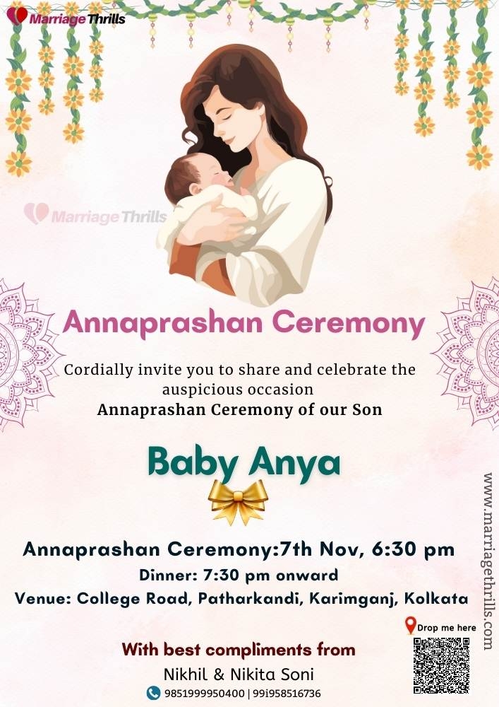 Our Annaprashan invitation templates come in a variety of designs and styles to suit your preferences. Whether you prefer a traditional, elegant look or a modern, playful design, we have something for everyone. Simply choose a template that resonates with you, customize the details, and you’re ready to send out invitations to your loved ones.