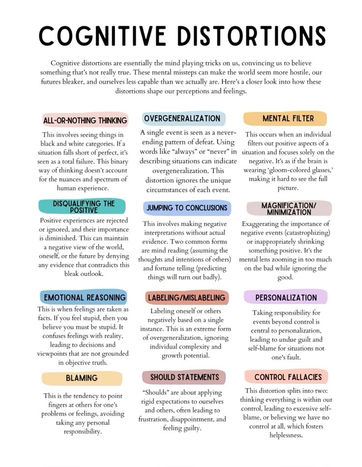 Cognitive distortions are irrational thoughts that can influence our emotions and behavior. These negative thought patterns can lead to feelings of anxiety, depression, and low self-esteem. Recognizing and challenging these distortions is an important step in improving our mental well-being.