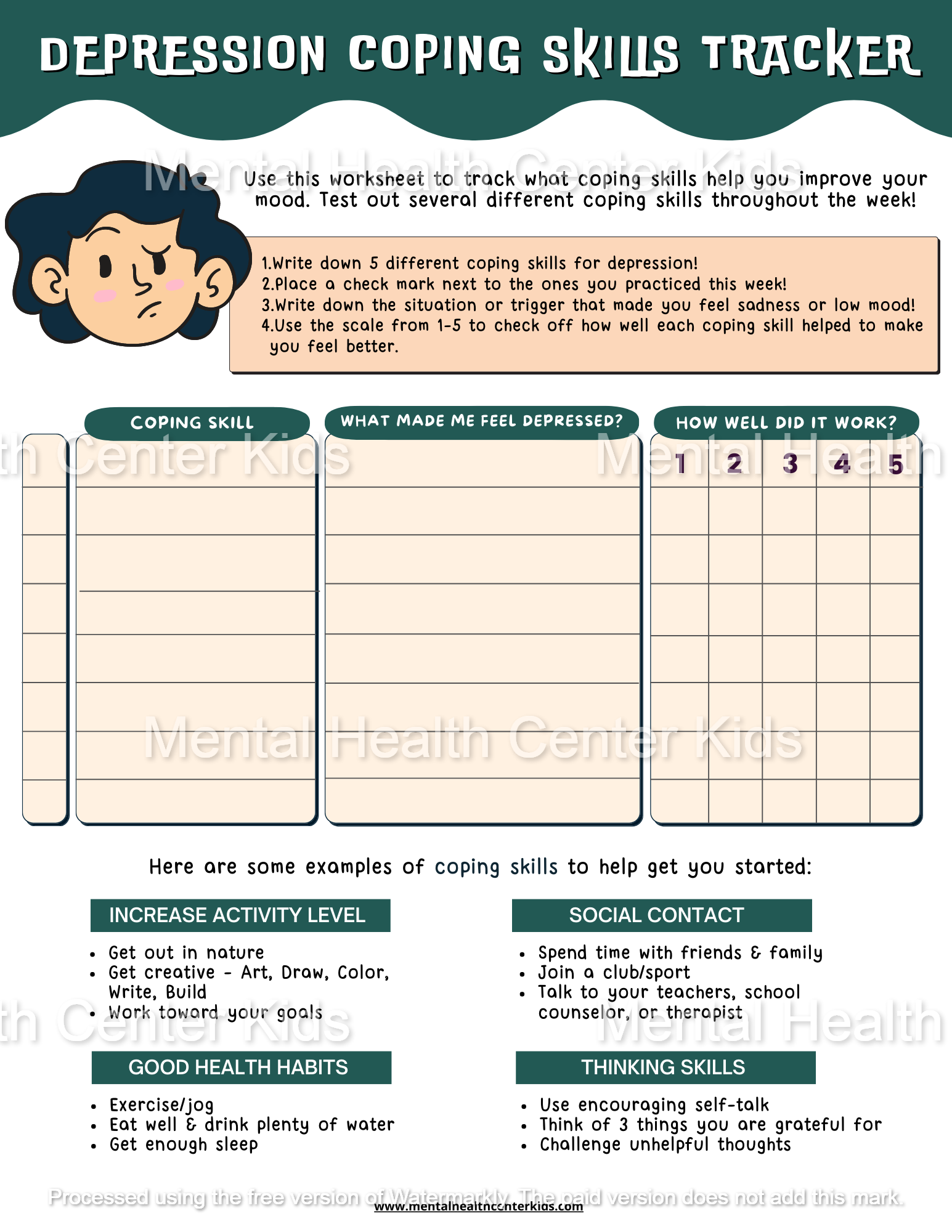 Another type of worksheet is a mood tracker. This tool allows individuals to track their moods throughout the day, week, or month. By keeping a record of their emotions, individuals can identify patterns and triggers that may be contributing to their depression. This information can help them make changes in their daily routine or seek support when needed.