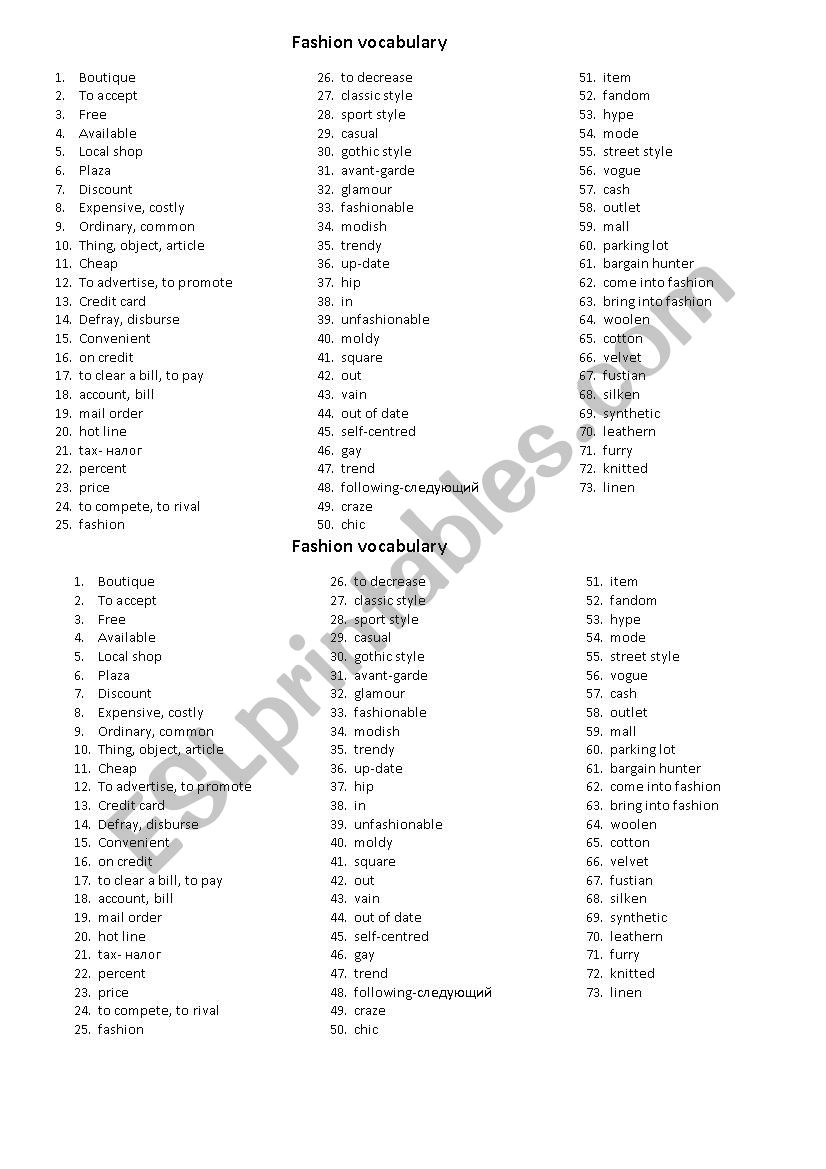 Additionally, a fashion vocabulary worksheet PDF can be a useful resource for educators teaching fashion-related courses or workshops. It can serve as a tool for lesson planning, assessment, and student engagement. Worksheets can be customized to suit different learning levels and objectives, making them versatile for use in various educational settings.