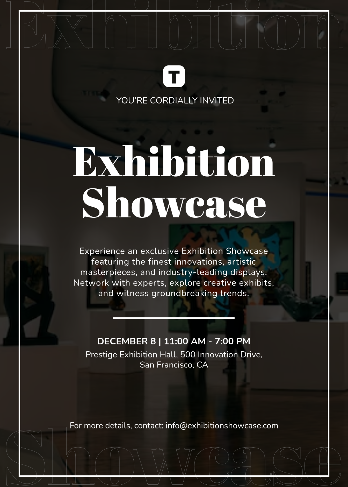 Choose a design that reflects the style and aesthetics of your exhibition. Whether you prefer a minimalist, modern look or a more elaborate and decorative design, the invitation template should align with the overall theme of your event. Consider using colors, fonts, and graphics that complement the content and create a cohesive and visually appealing invitation.