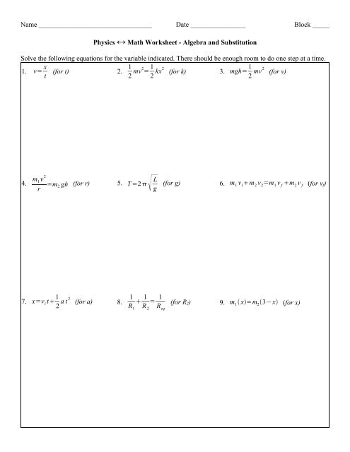 One common type of problem found on a physics equations worksheet is calculating the velocity of an object using the equation v = d/t, where v is the velocity, d is the distance traveled, and t is the time taken. By plugging in the given values for distance and time, students can calculate the velocity of the object. Another type of problem might involve calculating the force exerted on an object using Newton’s second law, F = ma, where F is the force, m is the mass of the object, and a is the acceleration.