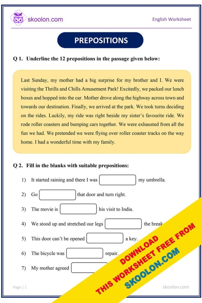 One common type of exercise found in prepositions worksheets is to fill in the blank with the appropriate preposition. For example, students may be asked to complete sentences like “The book is ______ the table” or “She walked ______ the park.” These exercises help students to recognize the correct preposition to use in different contexts.