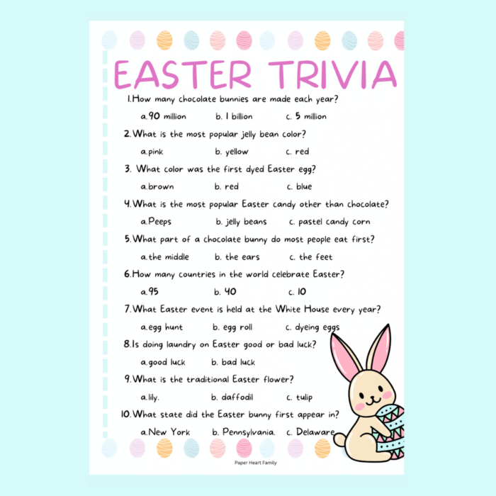 If you’re looking for a more challenging game, try a printable Easter trivia quiz. You can create a list of Easter-related questions and multiple-choice answers for players to test their knowledge about the holiday. This game is perfect for adults and older kids who enjoy a mental challenge.